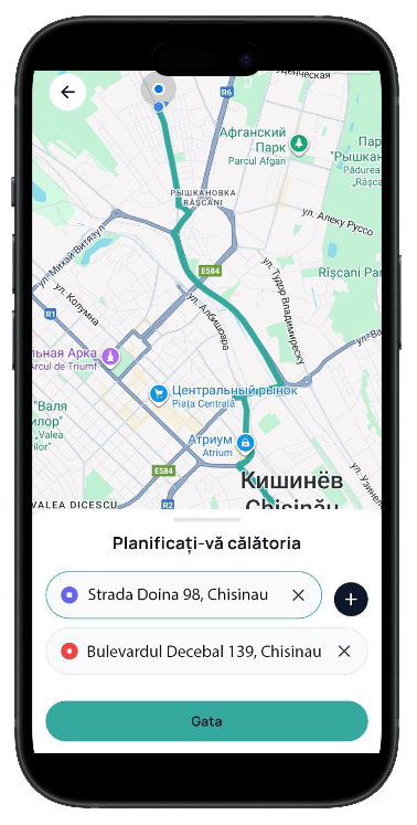 Aplicația noastră de taxi a fost creată special pentru Moldova, cu scopul de a face transportul urban și interurban mai simplu, mai sigur și mai accesibil. În doar câteva secunde poți comanda un taxi direct din telefon, fără apeluri, fără așteptări inutile și fără surprize neplăcute.